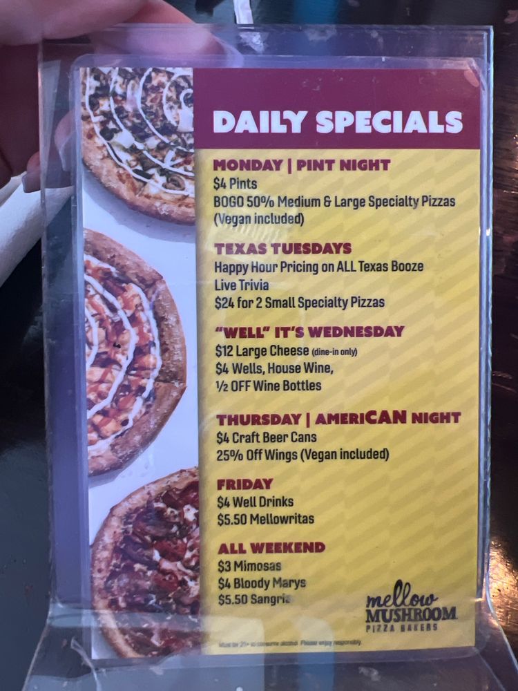 Welcome to Mellow Mushroom San Antonio, where pizza lovers indulge in a fantastic dining experience. Known for flavorful pizzas with perfectly baked crusts and a wide variety of topping options, this place is a must-visit. Highlights include generously stuffed calzones bursting with flavor, fresh and well-prepared salads, and the option to customize your own salad with a range of proteins. The customer reviews speak volumes about the quality and taste of the dishes here, making it a top spot for a casual meal. Don't miss out on the happy hour drink specials and the great beer selection. Whether you're craving pizza or looking for a cozy dining spot, Mellow Mushroom San Antonio is sure to impress with its delicious food menu and friendly service.