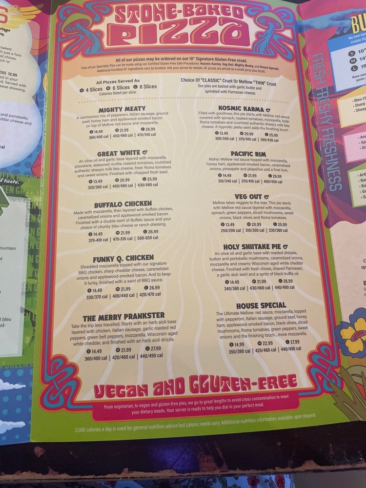 Start with a gluten free Cheese Pizza and go Mellow from there!!! (120 cal). Topping Choice (extra charges applicable): Bacon (+160 cal), Feta (+20 cal), Italian Sausage (+10 cal), Onions (+0 cal), Roma Tomatoes (+0 cal), Beef (+20 cal), Green Peppers (+0 cal), Mozzarella (+20 cal), Pepperoni (+35 cal), Provolone (+25 cal), Spinach (+0 cal), Vegan Cheese (+20 cal), Black Olives (+10 cal), Ham (+10 cal), Mushrooms (+0 cal), Pesto (+70 cal), Sundried Tomatoes (+20 cal).